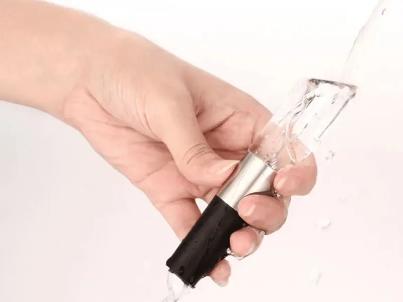 کنار چوب پنبه را نگه دارید و آن را باز کنید. وقتی صدای جریان هوا را میشنوید، بطری باز میشود.