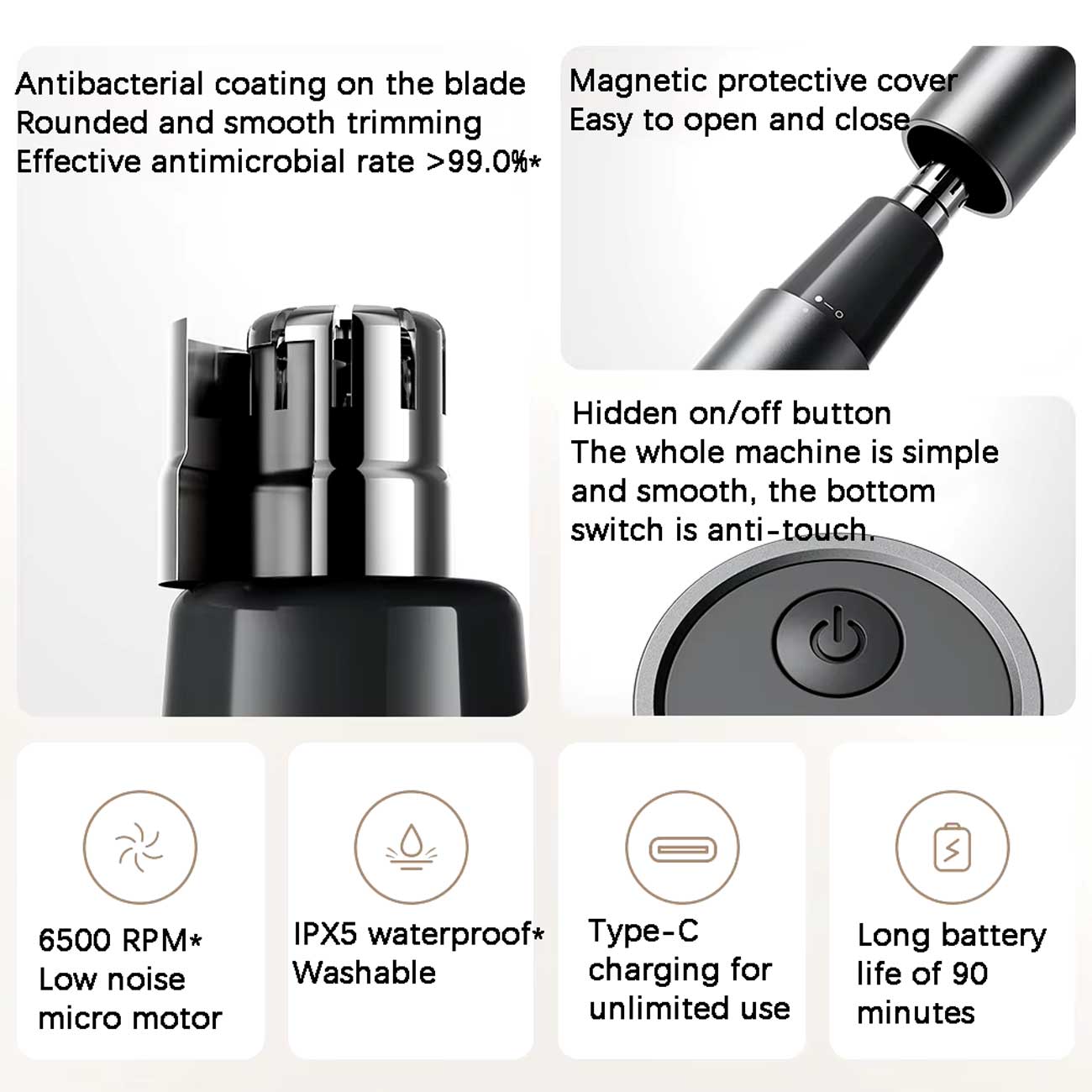 در طول پیرایش، تیغه ها تماس مستقیمی با حفره بینی ندارند و فاصله ایمن مشخصی را حفظ میکنند. موهای بینی را هم به نحوی کوتاه میکنند برای جلوگیری از استنشاق گرد و غبار و باکتری ها مناسب باشند.
