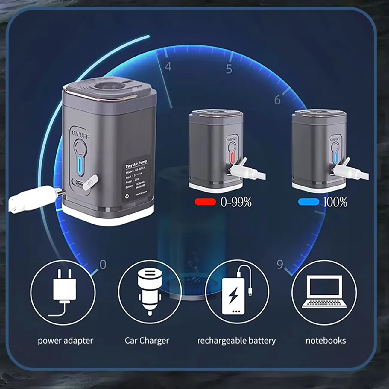 درگاه شارژ نوع C (شامل کابل usb) میتواند برای شارژ پمپ هوای فوق سبک به روشهای مختلف استفاده شود. مجهز به ظرفیت باتری ۱۲۰۰ میلیآمپر ساعتی با ورودی ۵ ولت/ ۱ آمپر است که میتواند تا ۲۵ دقیقه پس از شارژ کامل کار کند. پمپ هوا قابل شارژ تخت بادی ، به سادگی بهترین انتخاب برای ورزش در فضای باز است.
