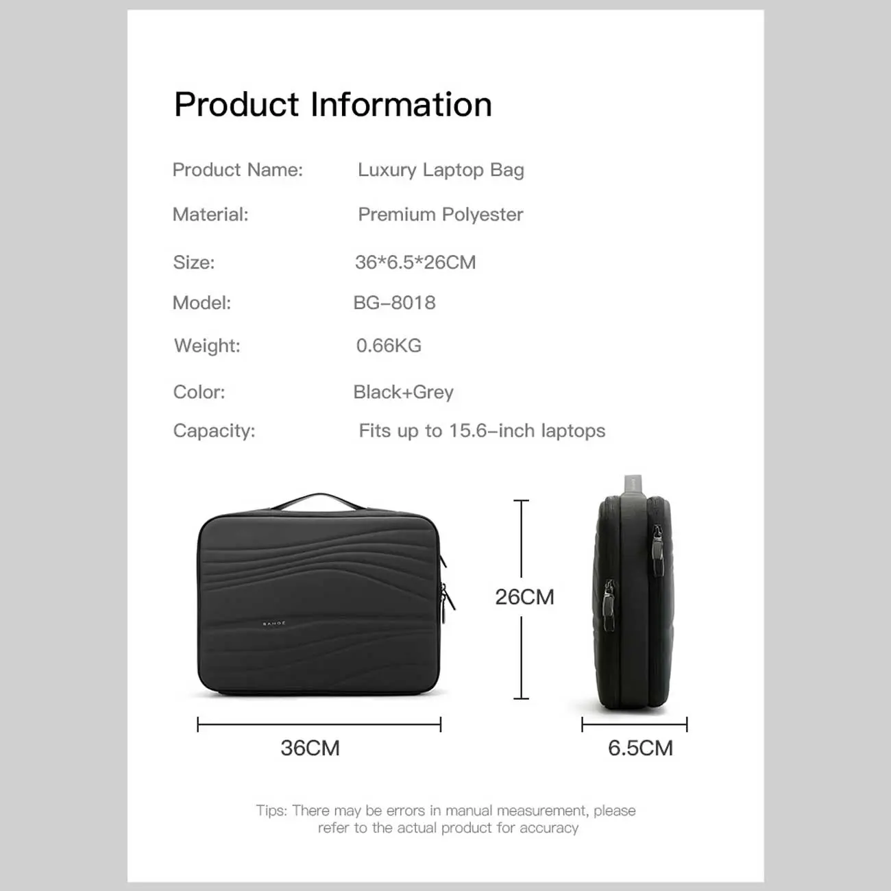 کیف اداری لپتاپ بنج مدل BG-8018 با ابعاد ۳۶×۲۶×۶.۵ سانتیمتر طراحی شده تا بهراحتی لپتاپهای ۱۴ تا ۱۵.۶ اینچی را در خود جای دهد.